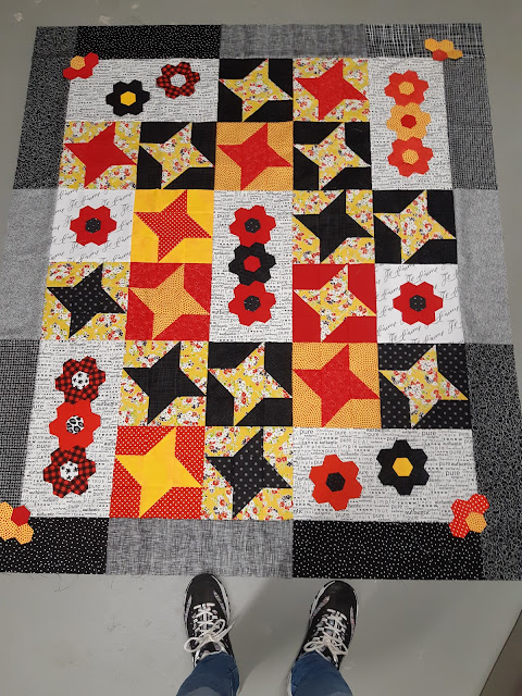 Sewing has been happening on and off when the mood hits. It's taken about a year, but this flimsy is nearly done. The last bit of applique is almost stitched down. I had no idea where I was going with this when I started making the friendship stars. All I knew was that I had some extra yellow that needed to be used. No material was bought for this specifically, mostly leftovers and rejects from other projects. My favourite part is the smaller corner flowers and the chunky border.